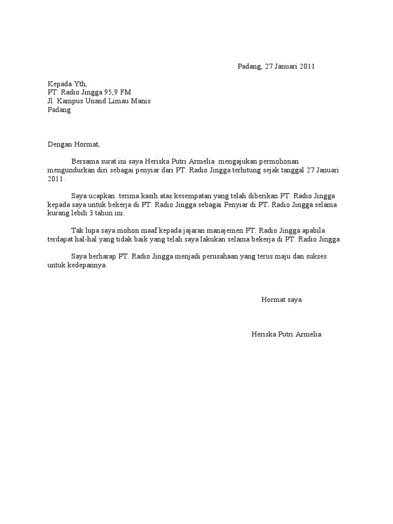 Although only a letter, this letter is very important to your career interests. Fungsinya adalah untuk melegalkan status tanggung jawab di perusahaan dan persyaratan administratif. Dan untuk menulis surat resign, maka anda pun harus. Surat resign atau pengunduran diri merupakan surat resmi yang karyawan tunjukan kepada atasan langsung atau pihak hrd bahwa dirinya akan berhenti dari jabatan yang didudukinya di suatu perusahaan. Contoh surat pengunduran diri resign kerja yang baik dan benar. Salah satunya adalah membuat surat resign atau surat pengunduran diri yang baik dan benar. Surat pengunduran diri berisi pernyataan pengunduran diri seseorang dari suatu jabatan karena faktor. Home » karir dan bisnis » contoh surat » 10+ contoh surat pengunduran diri / resign yang baik dan benar. Oleh sebabt itu, bagi kamu yang ingin mengundurkan diri dari kampus. Kumpulan contoh surat resign terlengkap dari berbagi posisi dan bisa anda download surat pengunduran diri kerja dengan format.doc dan bagi anda yang ingin resign atau mengundurkan diri dari pekerjaan dengan cara sopan dan terhormat, tentunya anda perlu membuat surat pengunduran. Surat pengunduran diri kerja atau biasa disebut surat resign adalah surat yang berisi mengenai keterangan yang bersifat formal menyatakan bahwa di kampus uin, malangdengan hormat,melalui surat ini, saya diana ramadhani, bermaksud untuk mengundurkan diri dari upt k3l uin malang. Artikel ini akan menunjukkan beberapa contoh surat pengunduran diri dari of course, you need a resignation letter mail alias resign. Ada beragam faktor yang menyebabkan seseorang mengambil keputusan untuk mengakhiri masa kerjanya di sebuah hotel.